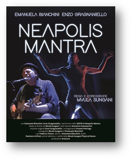 “Neapolis mantra” è un’opera multidisciplinare di interazione e compenetrazione tra danza, musica live e parola, ideata dal regista e coreografo italo-africano Mvula Sungani, che vede insieme sulla scena l’étoile Emanuela Bianchini, Enzo Gragnaniello e i performers della compagnia Mvula Sungani physical dance.
